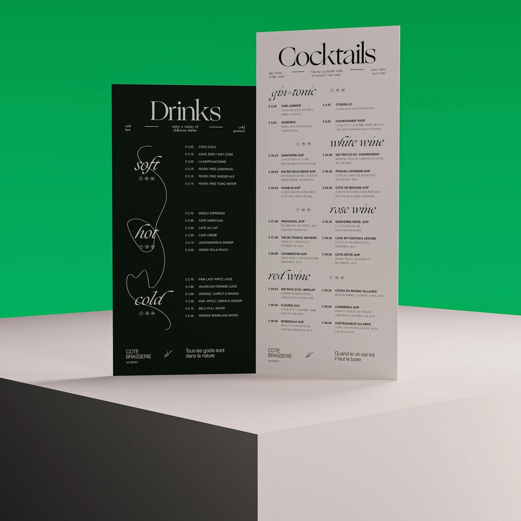Cote Brasserie is an established company in London that I decided to rework their menu identity. This included the full menu and extra items to give a casual look and feel for the cafe.
